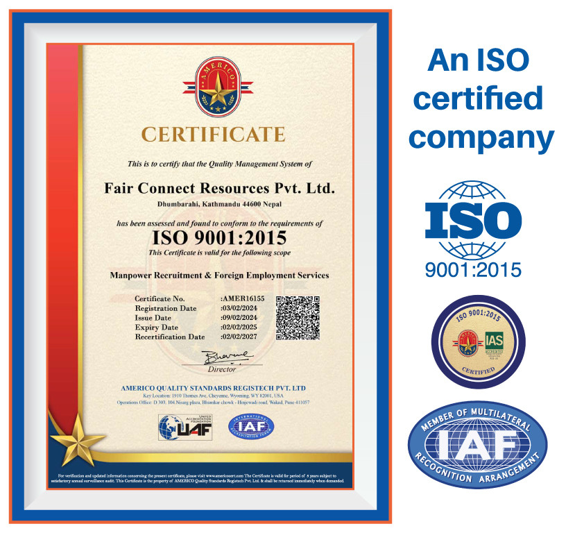 Our inception is marked by a significant milestone – obtaining the recruiting license number 1279/074/075. This not only legitimized our operations but also set the stage for a journey characterized by integrity, accountability, and a relentless pursuit of quality. At Fair Connect Resources P. Ltd., we are more than just a manpower supply agency; we are a collective of visionaries, strategists, and innovators. Our foundation is built on the profound expertise of a young and energetic team, boasting 20 years of cumulative experience in the HR industry. This rich background has equipped us with invaluable insights and a comprehensive understanding of the global employment landscape.
